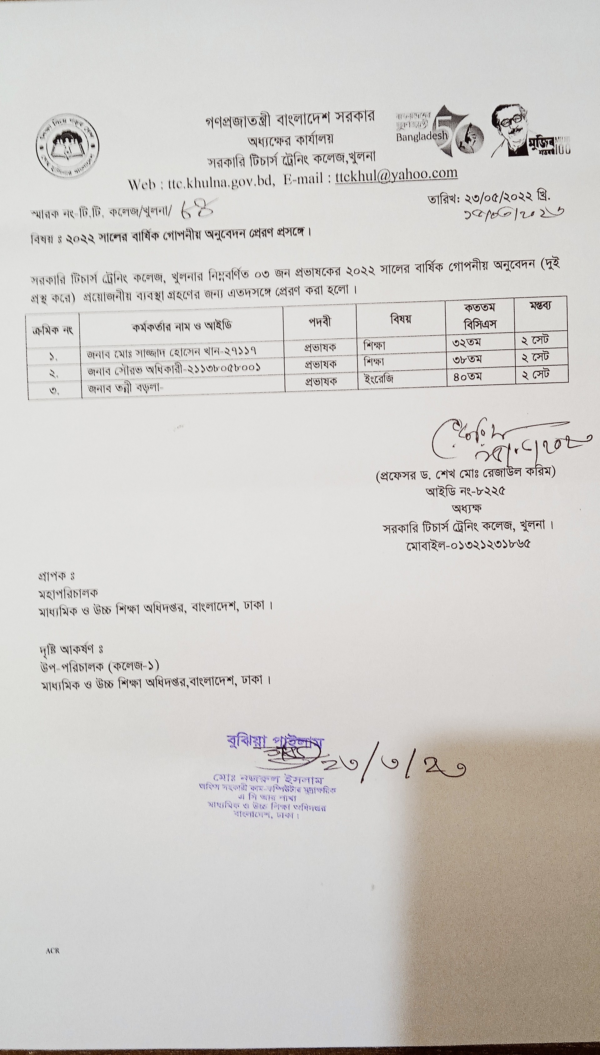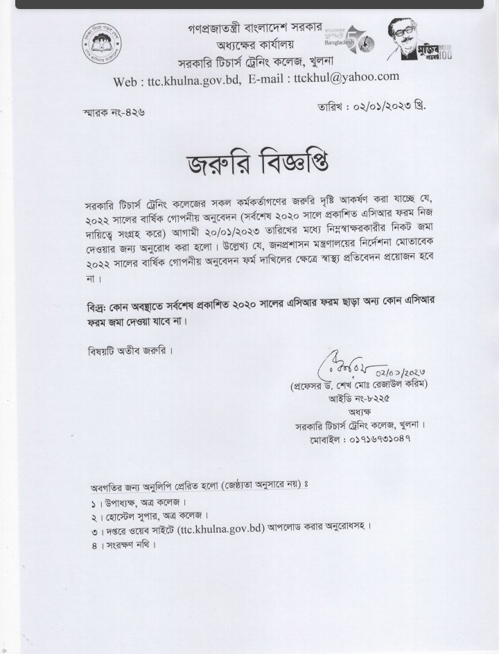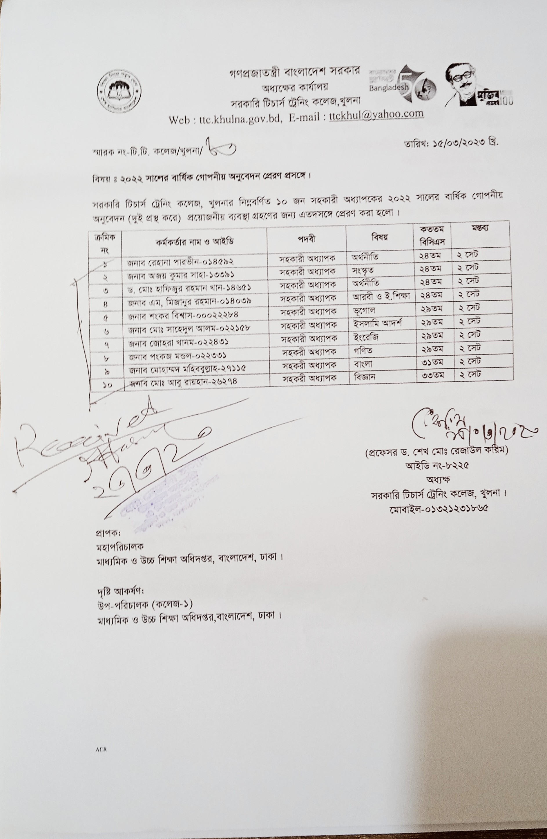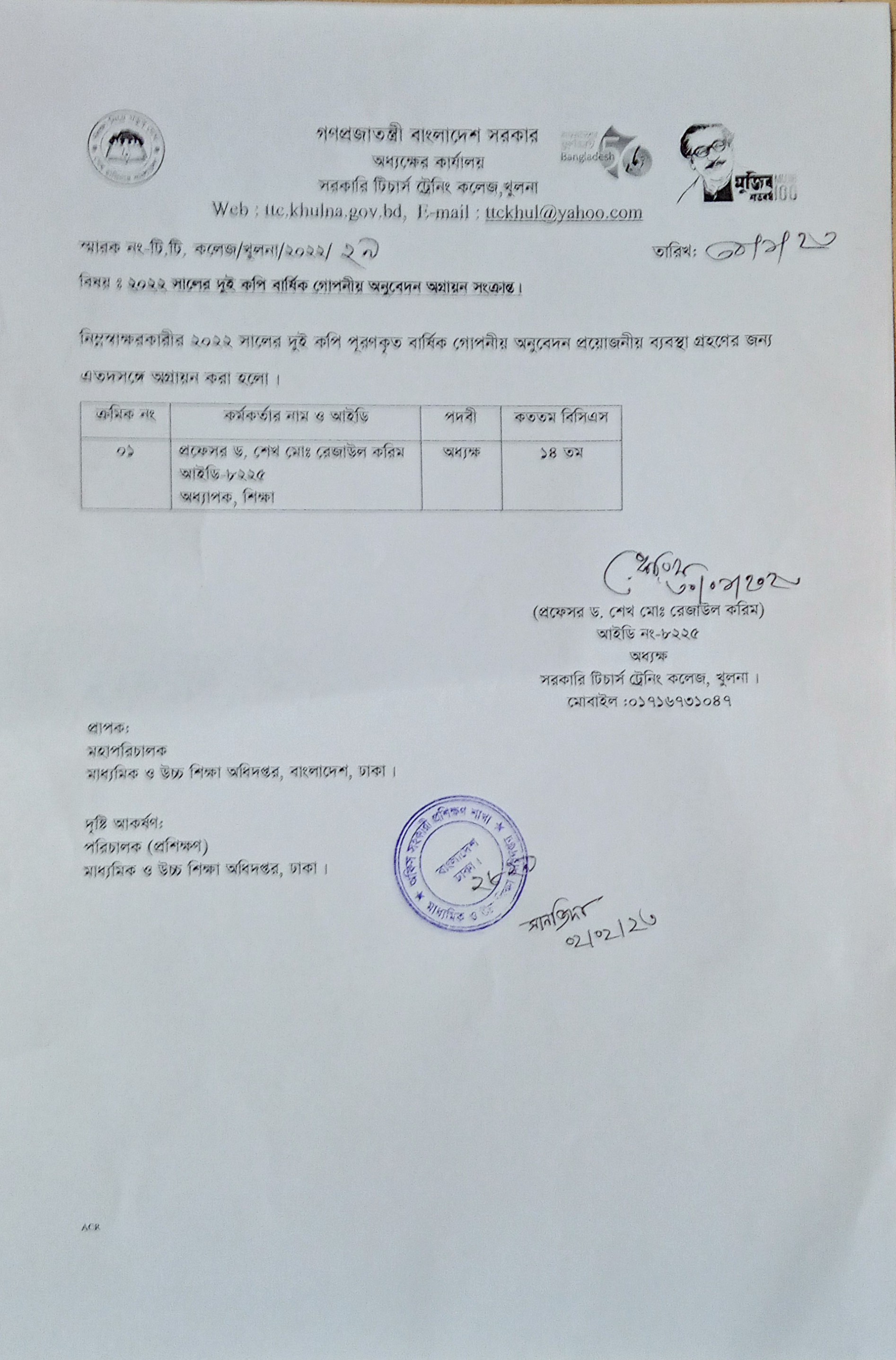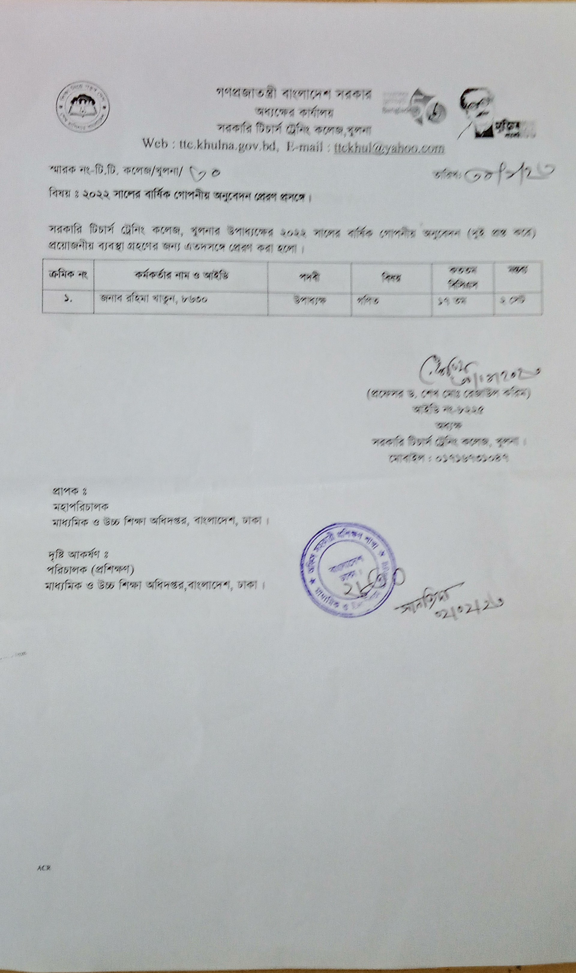 এসিআর, অধ্যক্ষ, ২০২১,প্রাপ্তিস্বীকার কপি