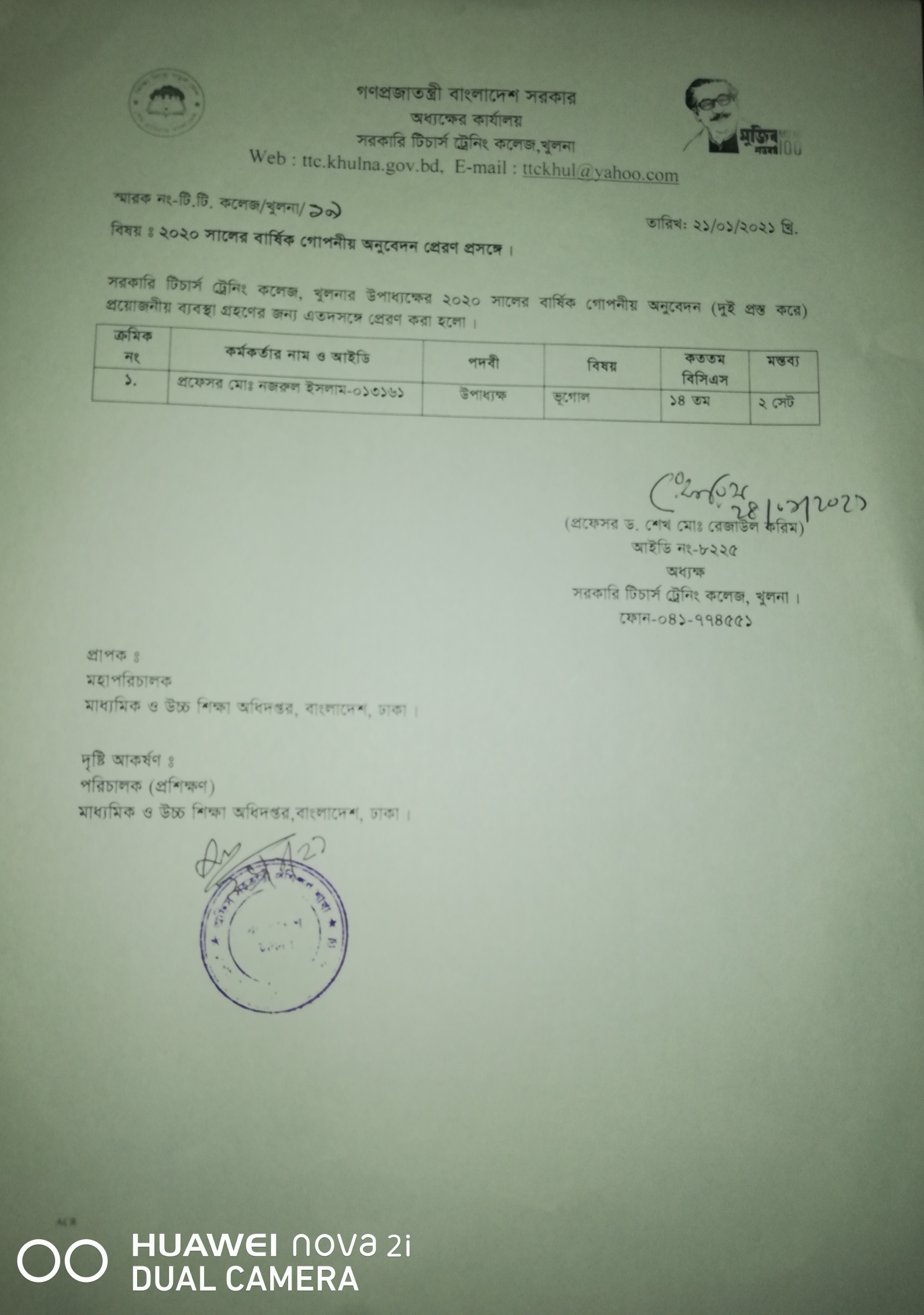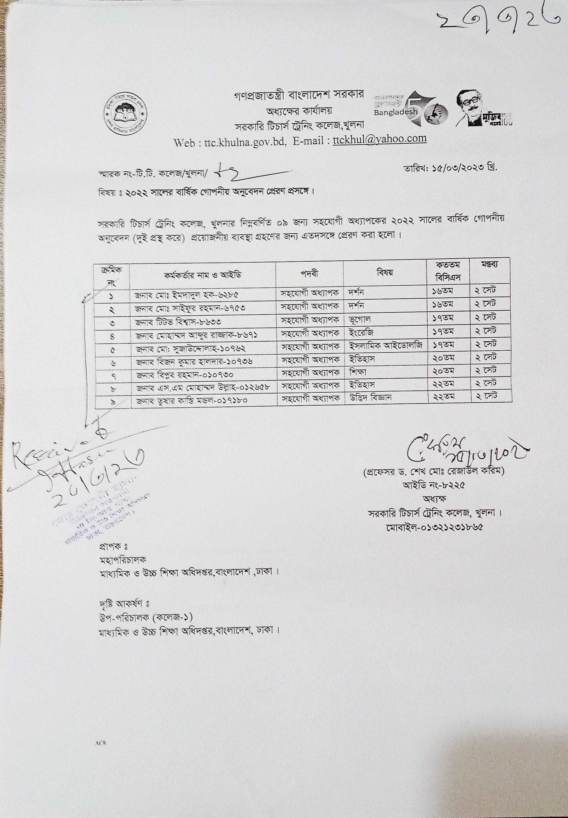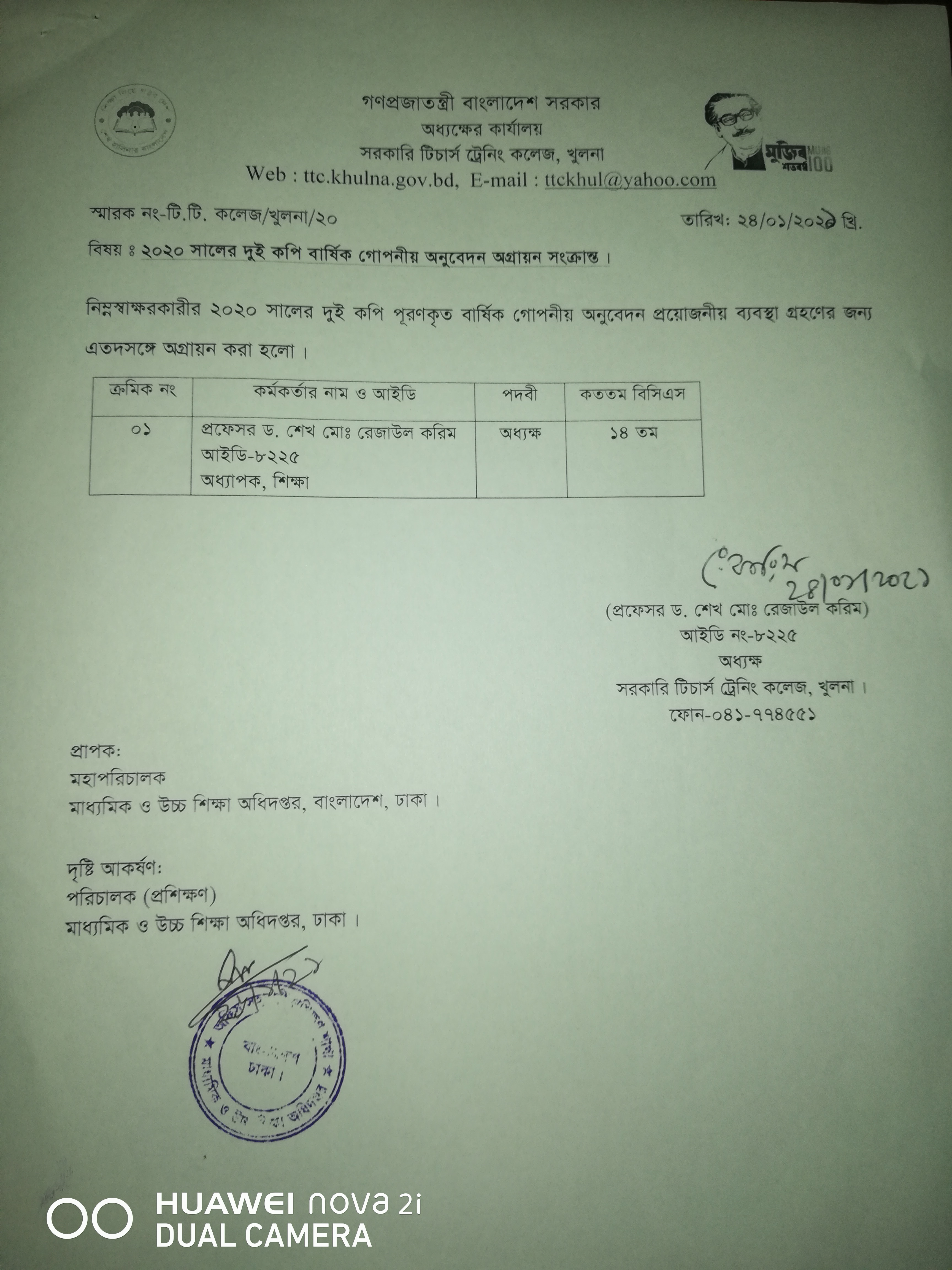 এসিআর,সহযোগী অধ্যাপক, ২০২০,প্রাপ্তিস্বীকার কপি