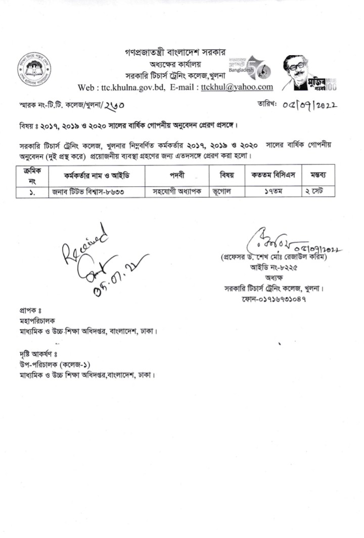এসিআর, উপধ্যক্ষ, সহযোগী অধ্যাপক, সহকারী অধ্যাপক ও প্রভাষকদের ২০১৭,প্রাপ্তিস্বীকার কপি