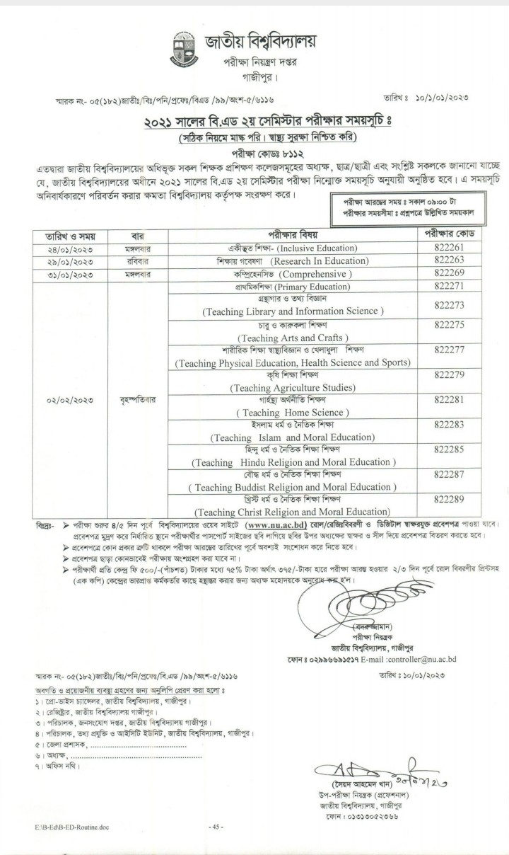 বিএড-২য় সেমিস্টার ২০২১ এর অনলাইন ক্লাশ রুটিন
