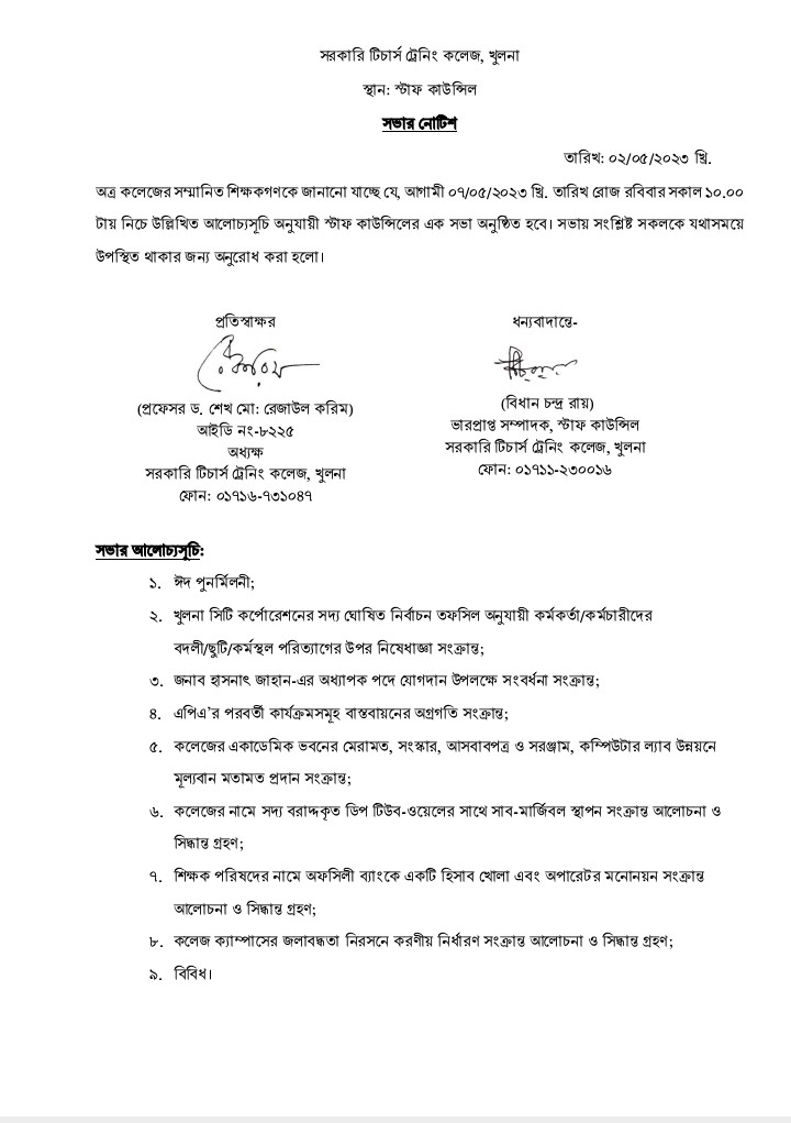 স্টাফ কাউন্সিল সভা নোটিশ, তারিখঃ ০৩/১০/২০২১