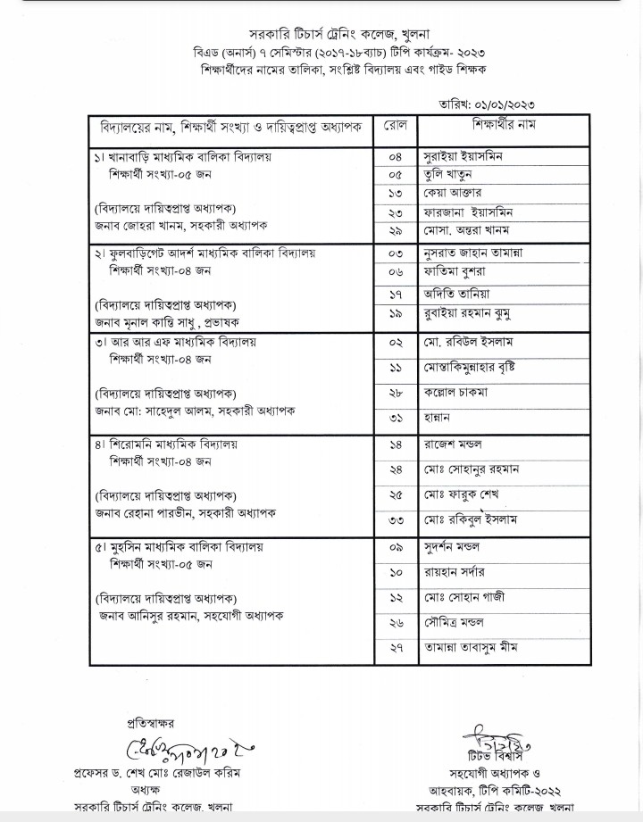 রোল বন্টন, পাঠদান অনুশীলন রুটিন, বিএড(অনার্স)-৭ম সেমিস্টার ২০২১